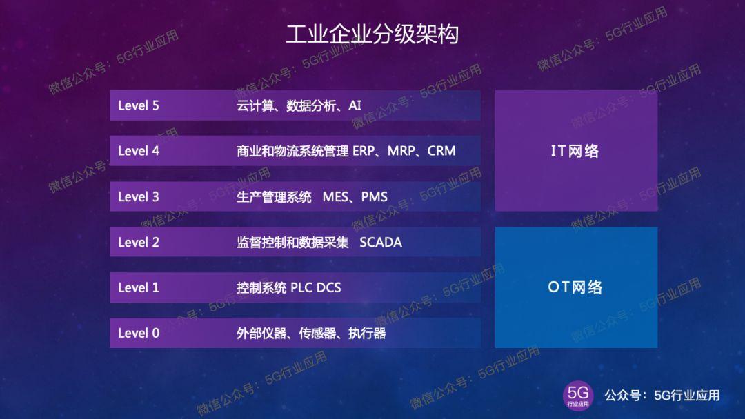 工業(yè)企業(yè)的OT(Operation Technology)和IT(Information Technology)系統(tǒng)采取分級架構(gòu)。其中OT系統(tǒng)從下往上包括Level 0級外部儀器、傳感器、執(zhí)行器等;Level 1級控制系統(tǒng)PLC,DCS等;Level 2級監(jiān)督控制和數(shù)據(jù)采集SCADA。IT系統(tǒng)從下往上包括Level 3級生產(chǎn)管理系統(tǒng)MES、PMS;Level 4級商業(yè)和物流系統(tǒng)管理ERP、MRP、CRM等;Level 5級云計(jì)算、數(shù)據(jù)分析和AI等。5G的無線接入技術(shù)和網(wǎng)絡(luò)技術(shù)對OT和IT系統(tǒng)的支撐,將從架構(gòu)底層向上層逐步延伸。